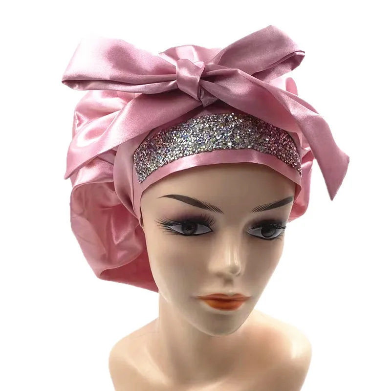 This luxury satin hair bonnet offers a blend of superior hair protection and elegant style. Designed for both overnight use and as a fashionable accessory, this bonnet keeps your hair healthy while elevating your look with sophisticated sparkle. Protective Design for Hair Health Crafted sleep. The smooth material prevents tangling and frizz, ensuring your hairstyle remains intact. Its generous size accommodates long hair, braids, extensions, and voluminous hairstyles with ease. Comfort and Fit A key feature of this bonnet is its wide, elastic edge, which provides a comfortable and secure fit without creating pressure marks or damaging your hairline. This design helps protect your edges various head sizes. Elegant Rhinestone Embellishments Beyond its protective function, this bonnet is designed to be worn as a statement piece. The tie features a continuous band of shimmering rhinestones that provide a glamorous touch. The satin material itself has a subtle glitter finish, adding to its luxurious appearance. Whether used for a formal evening or as a stylish headwrap, this bonnet delivers a sophisticated aesthetic. Key Features: – Premium Satin Material: Minimizes friction, reduces breakage, and retains moisture. – Wide Edge Design: Ensures comfort, protects delicate edges, and provides a secure fit. – Long Length: Accommodates long hair, braids, and extensions comfortably. – Rhinestone Tie: Adds a touch of glamour with sparkling embellishments. – Versatile Use: Ideal for overnight protection or daytime fashion.
