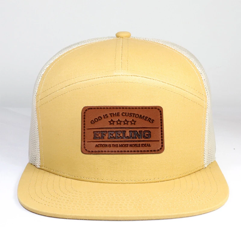Elevate your style with this versatile and durable 5-Panel Snapback Trucker Hat. Crafted distinctive flat brim and custom leather patches add a touch of unique personality, making it a standout piece in any outfit.