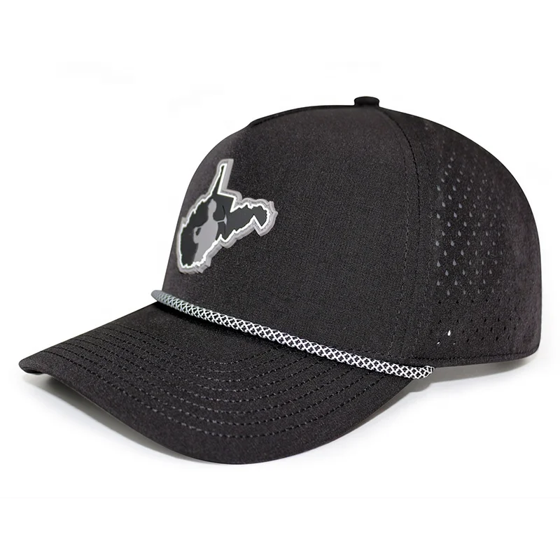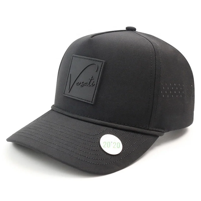 HN10 Custom 5 Panel Golf Dad Hat Veracap Rubber Pvc Logo Rope Baseball Cap Waterproof Laser Cut Hole Perforated Black Cap