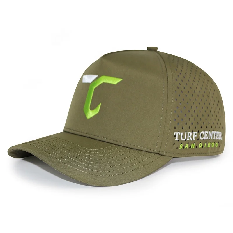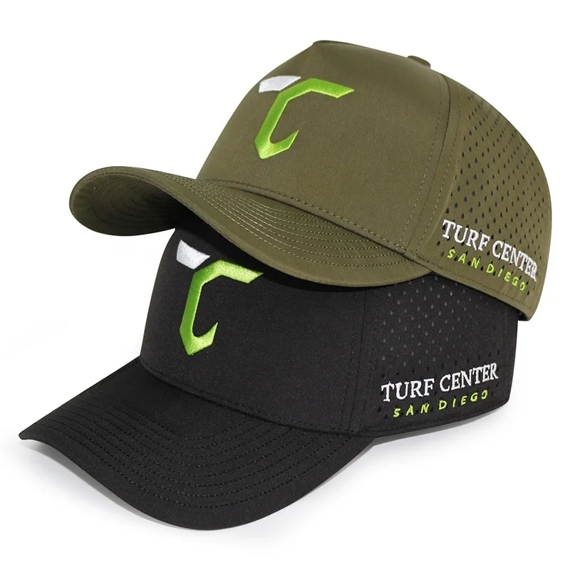 HS41 High Quality Custom Curved Brim 5 Panel Green Black Embroidery Laser Cut Hat Baseball Cap for Adults