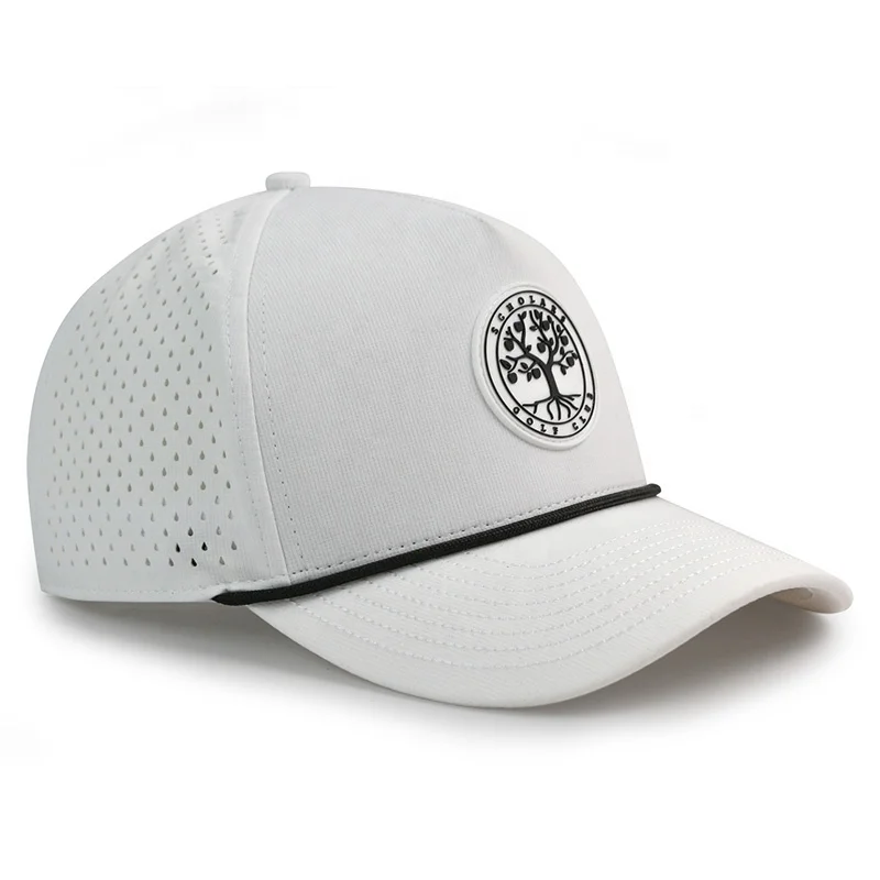 HS51 Unisex Custom Pvc Rubber Patch logo Waterproof Laser Cut Hole White Rope Hat Golf Hat with Tee Holder