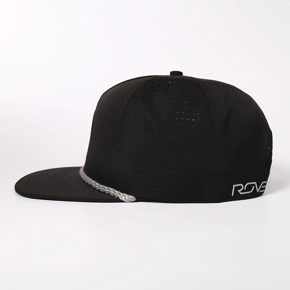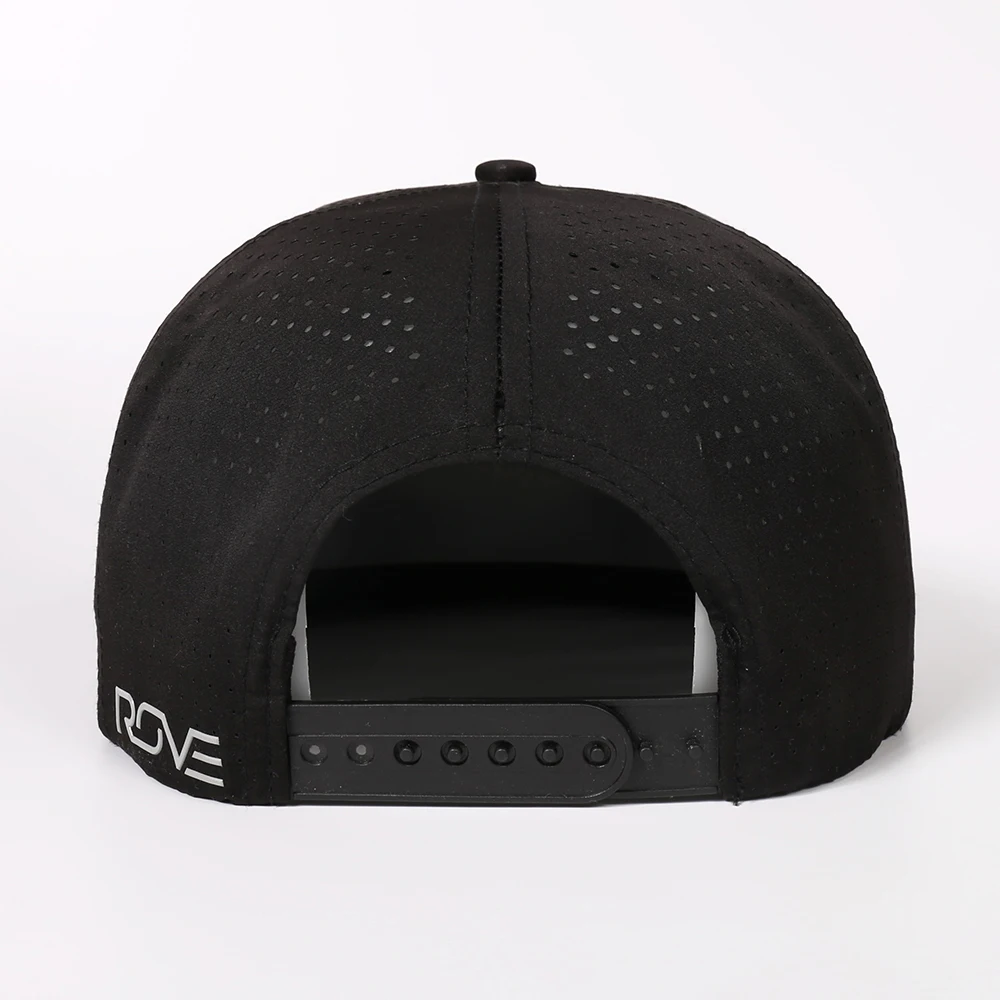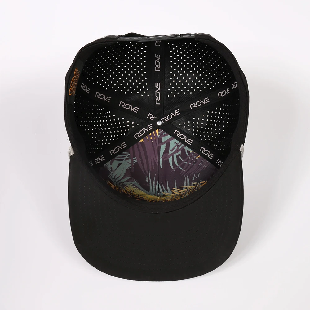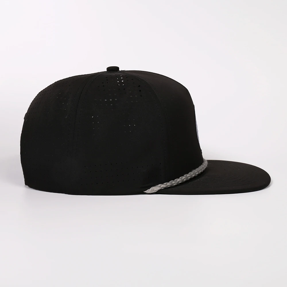 OEM Custom Polyester Waterproof 5 Panel Laser Cut Perforated Flat Brim Hat Embroidery Logo Snapback Cap