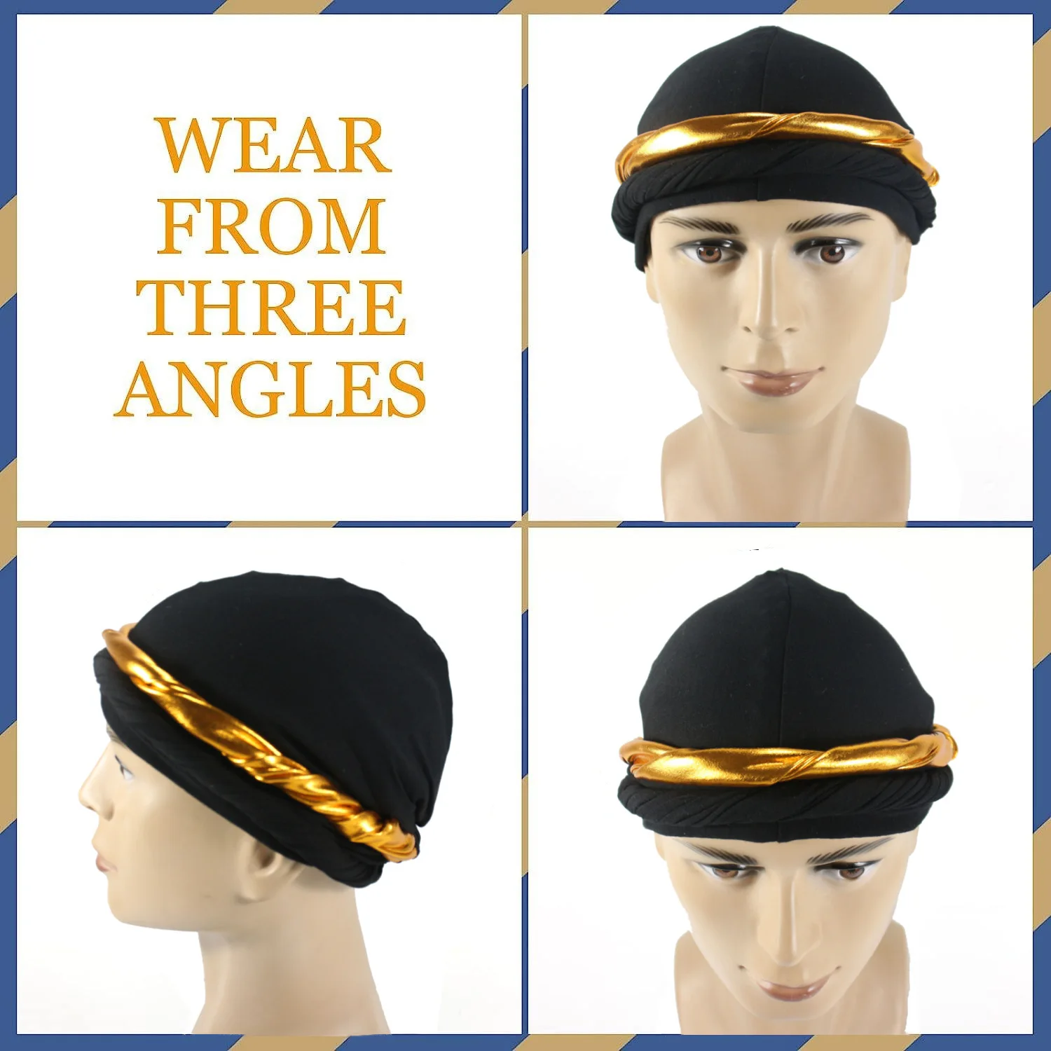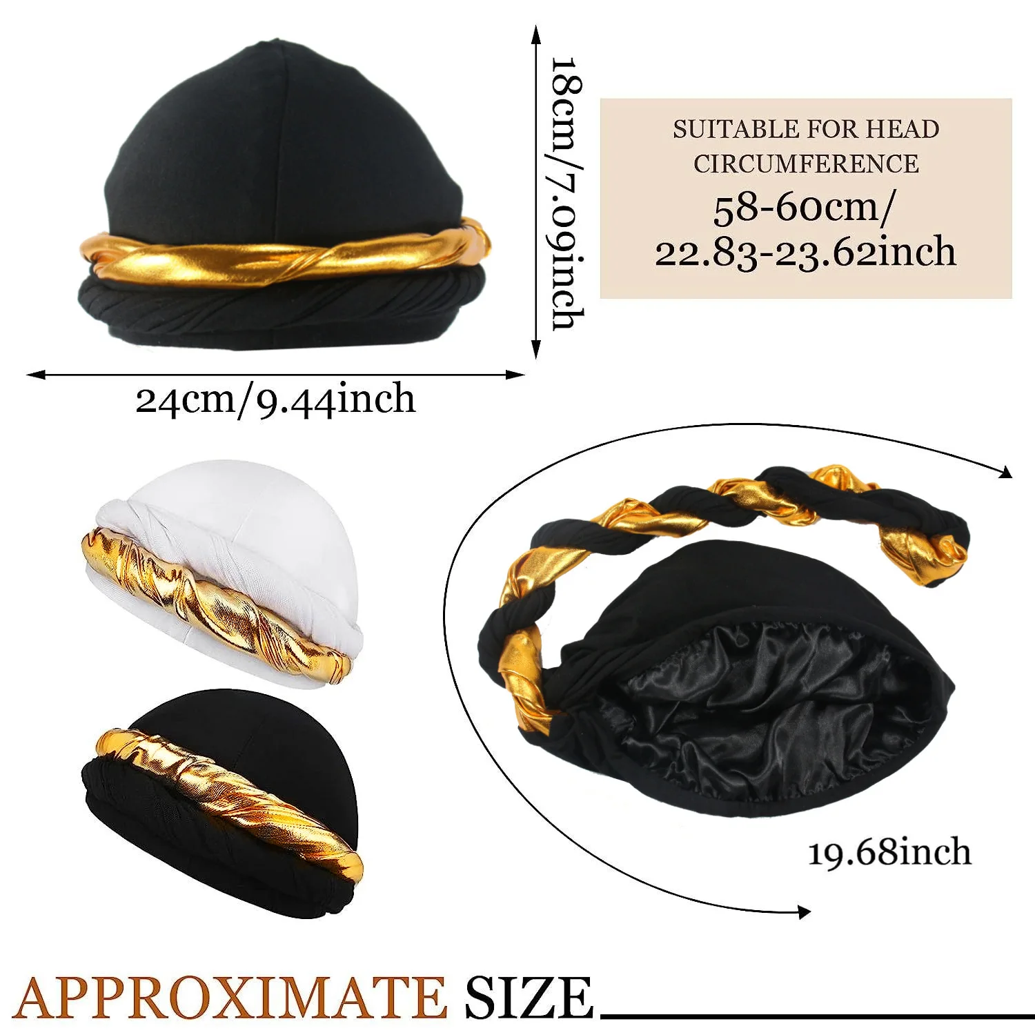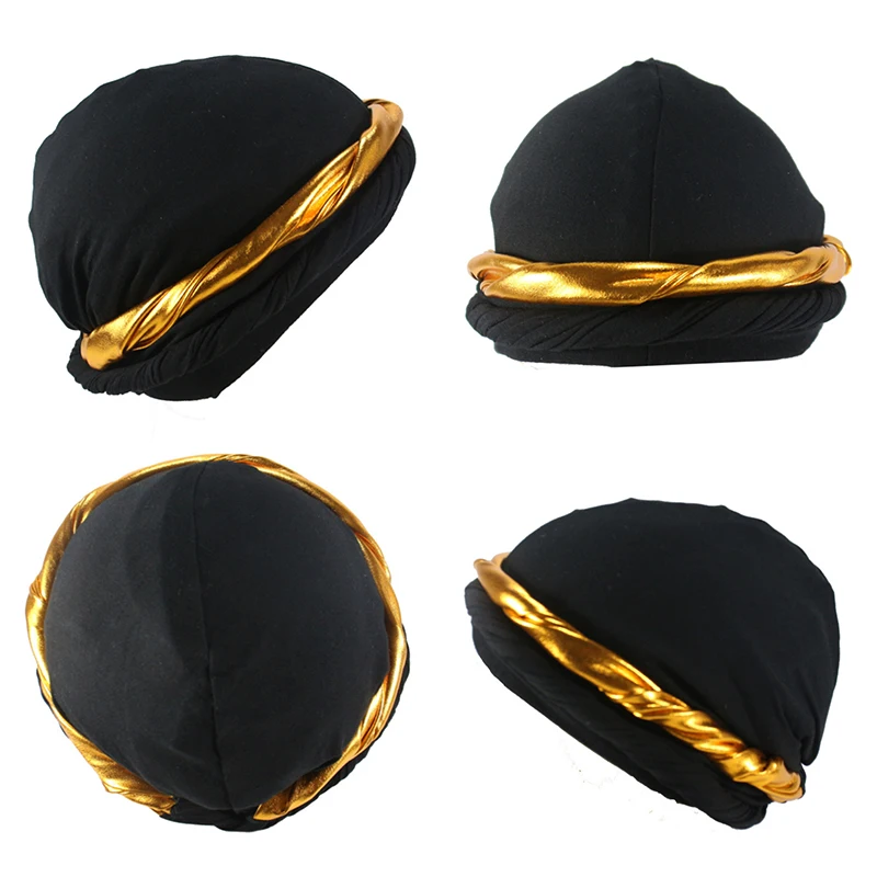 Silk Satin Lined Pre-Tied Halo Twisted Golden Braid Men Turban Durag Head Wrap Skull Wave Cap for Men