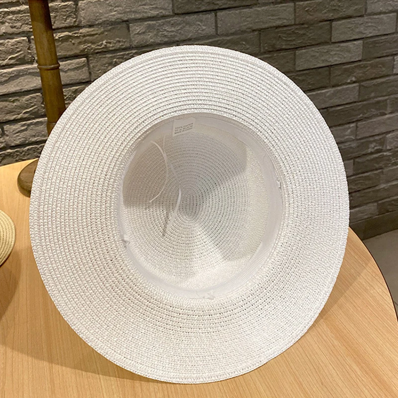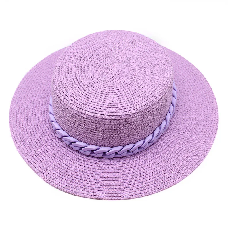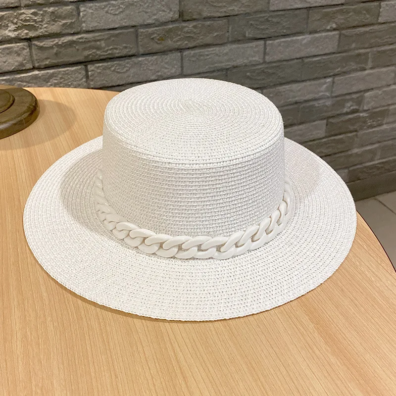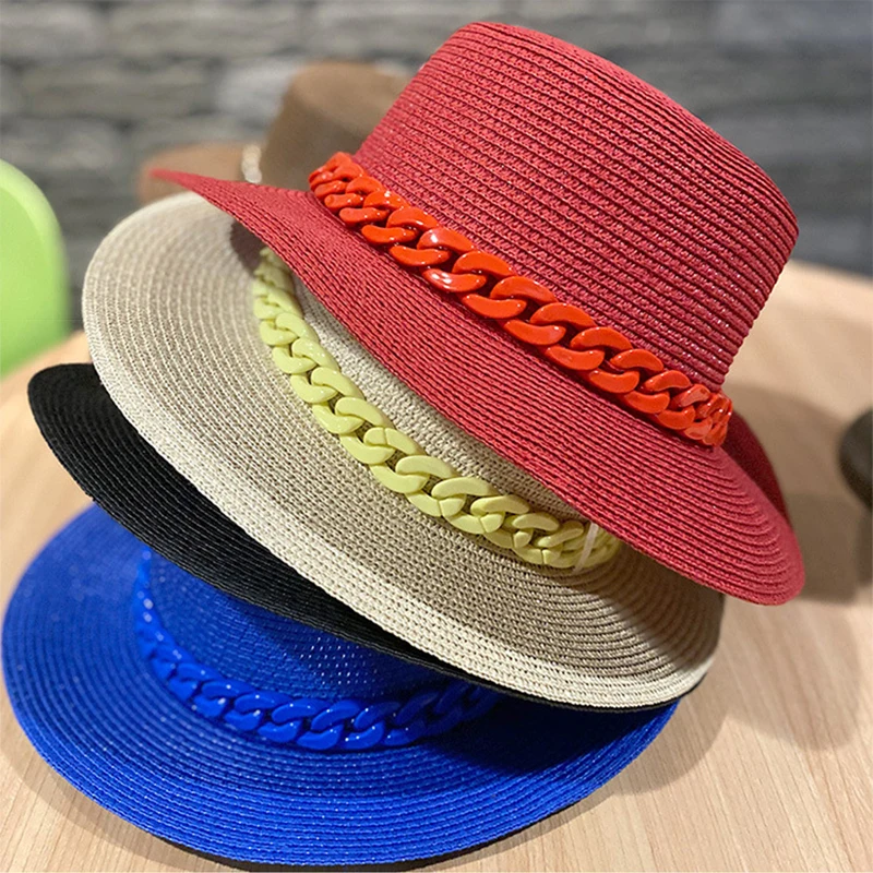 Summer Women Straw Boater Hat Fedora Panama Style Flat Top Sun Straw Hat With Chain