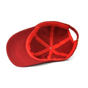 Stylish red unconstructed cotton baseball cap for men women. This adjustable plain golf dad hat offers comfort and versatile everyday wear.